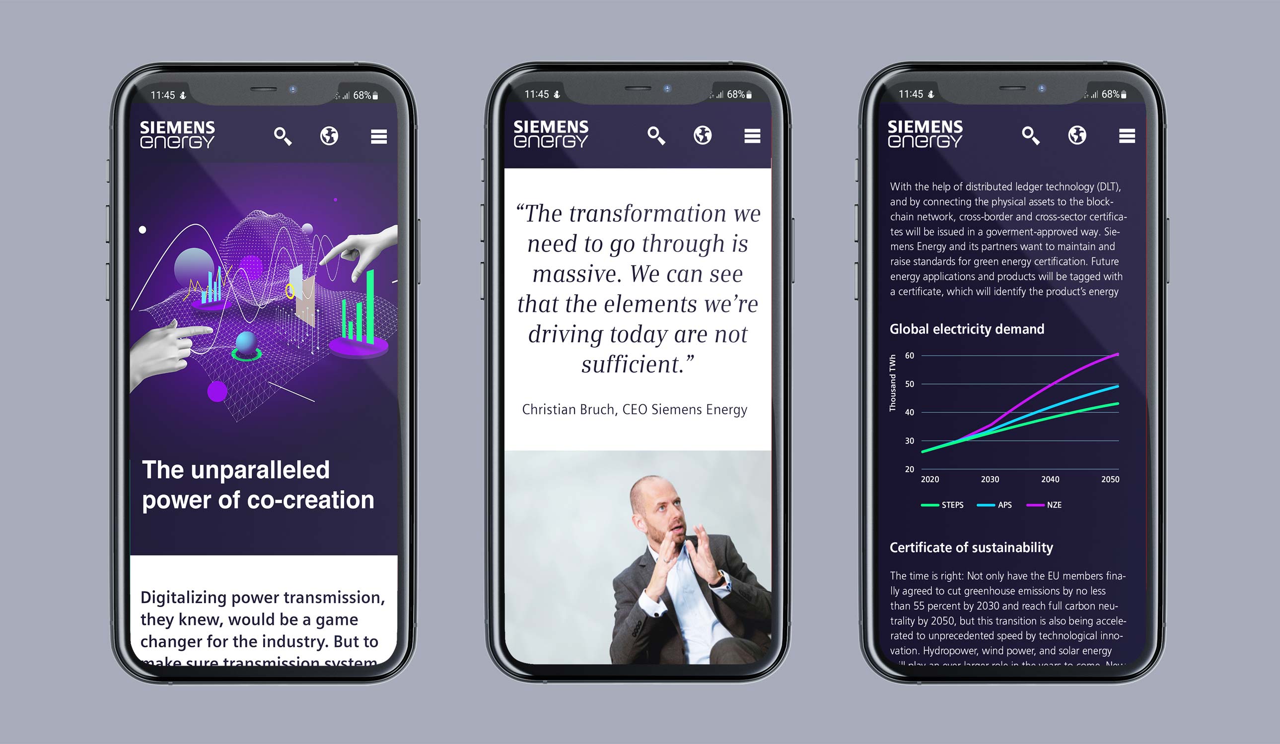 In Zusammenarbeit mit der Editorial-Agentur Primafila Zürich unterstützen wir Siemens Energy als langfristiger Partner bei der Entwicklung und Umsetzung vielfältiger Kommunikationsmaßnahmen. Dazu zählen redaktionelle Websitebeiträge, Sustainability Reports, Infografiken sowie visuelle Inhalte für digitale Kanäle. Stets mit dem Ziel, komplexe technologische und nachhaltigkeitsrelevante Themen klar, verständlich und visuell präzise zu vermitteln.